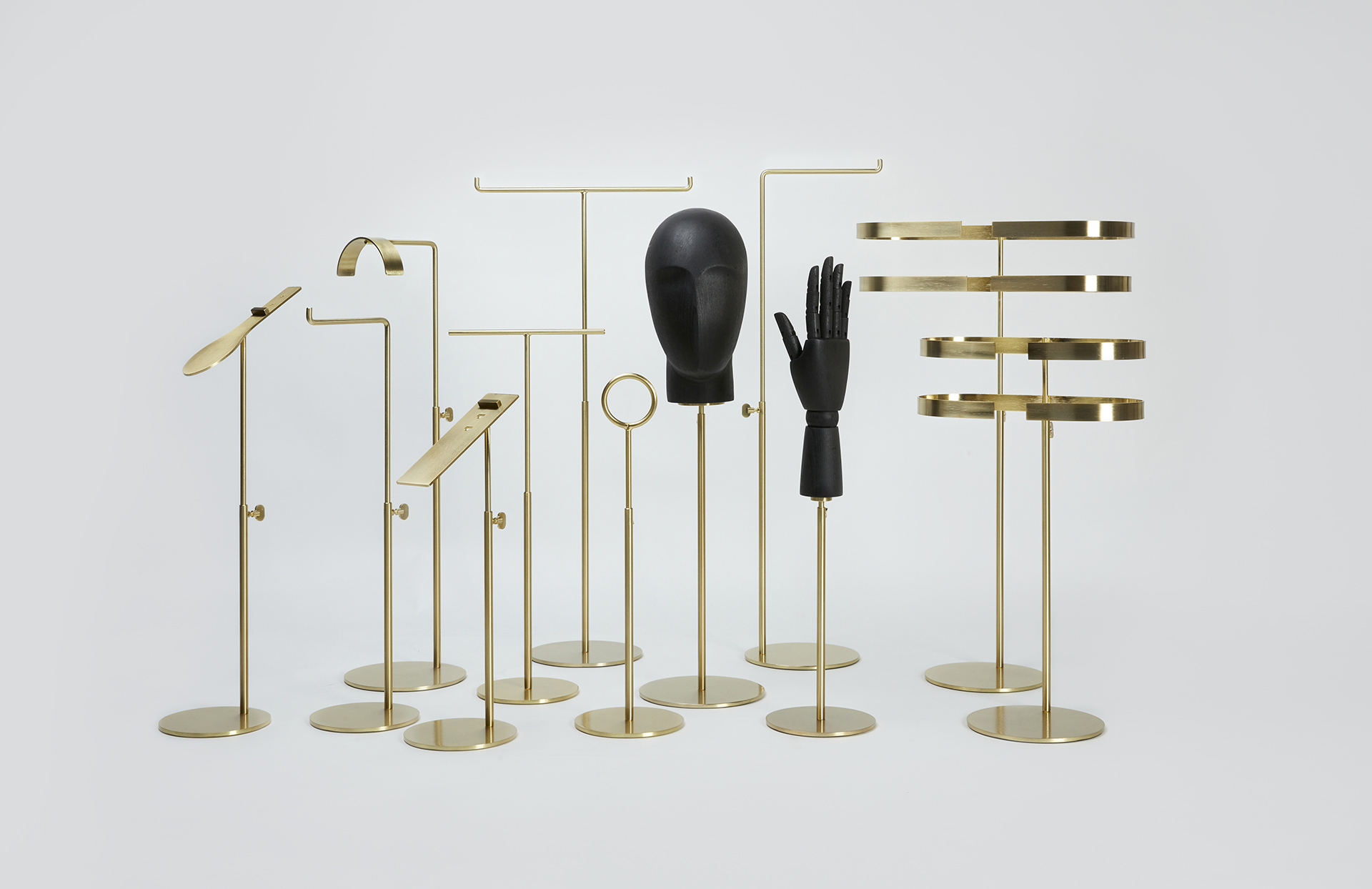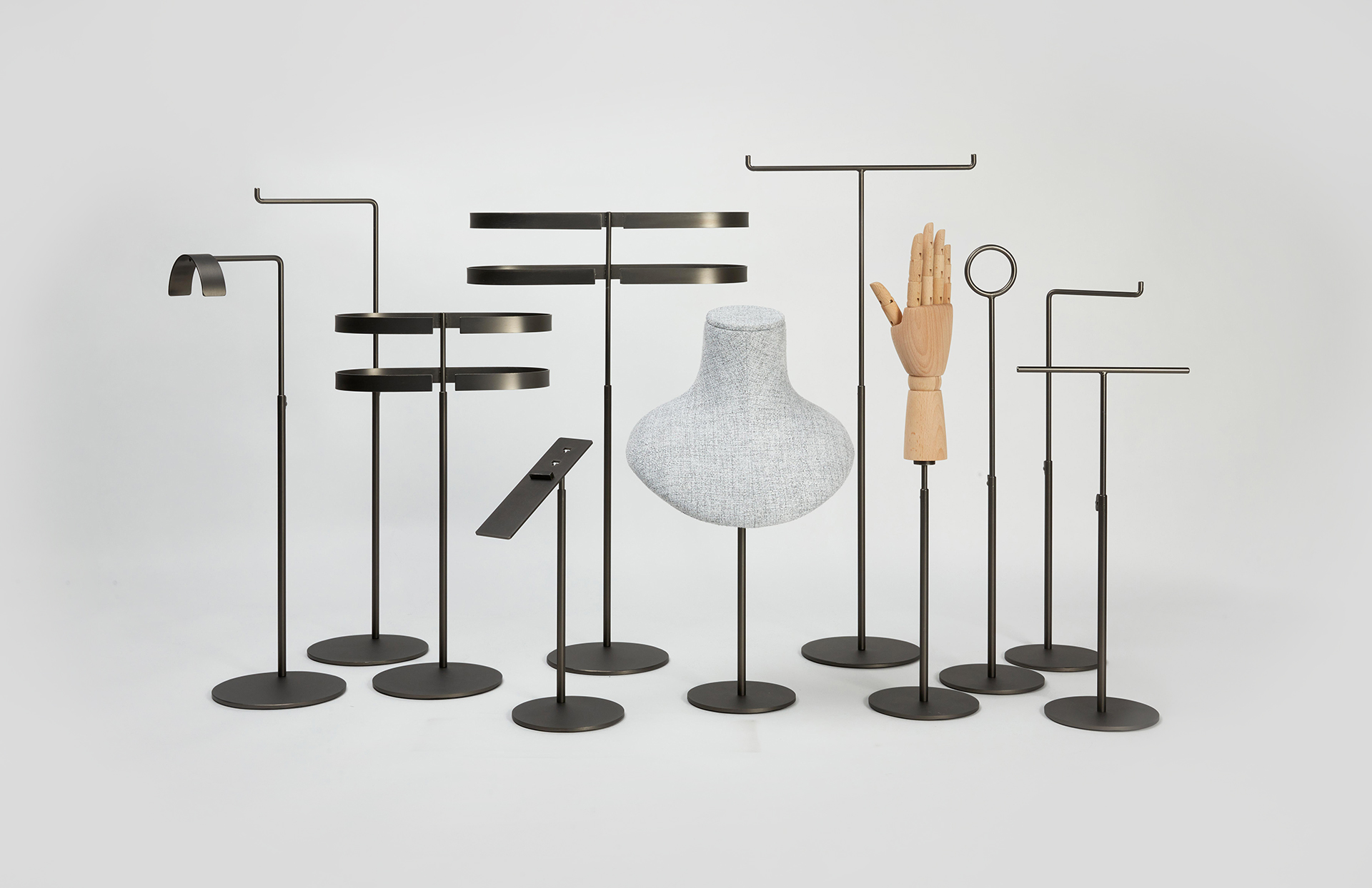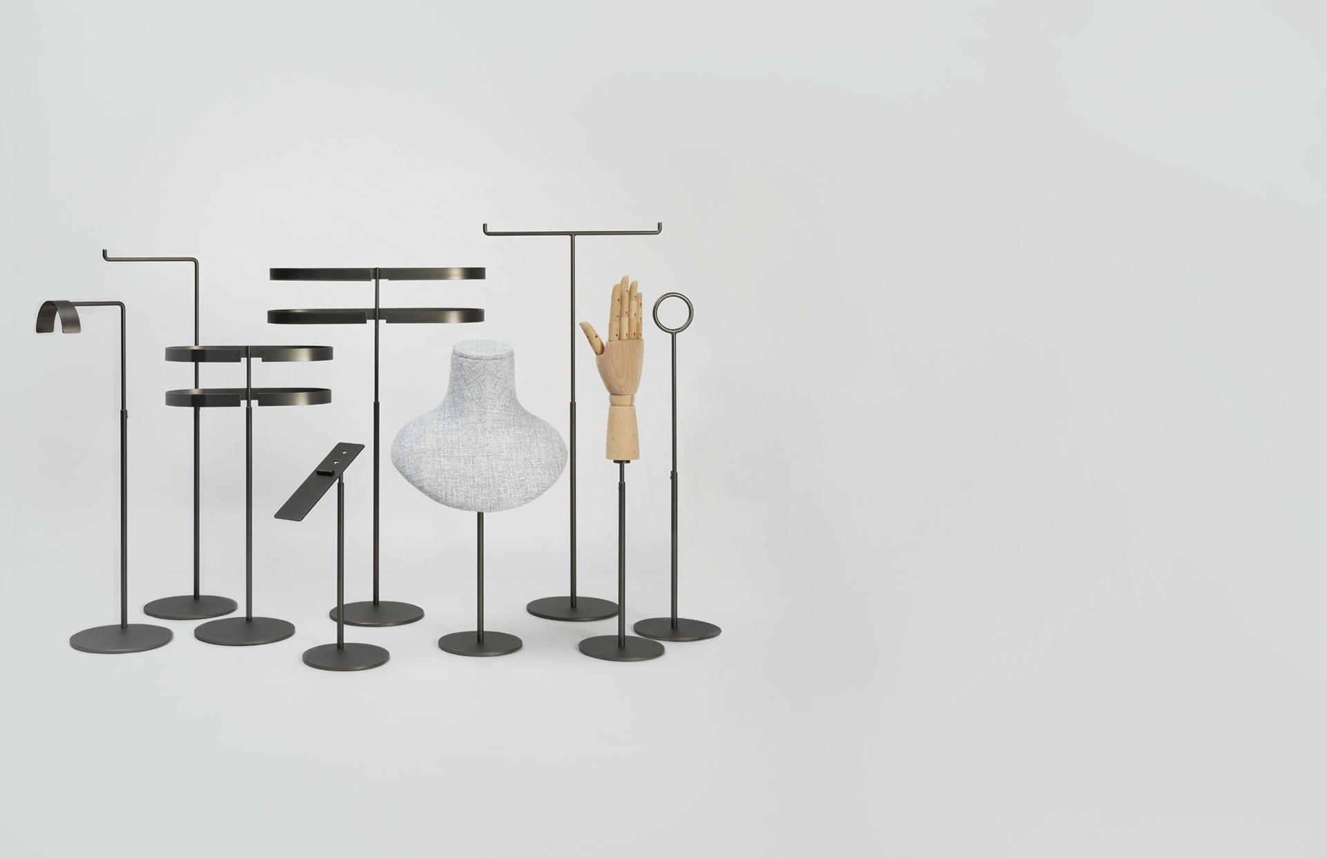 NARBONA es una topografía de podios y soportes pensados para construir paisajes expositivos acogedores. Sus bases escalonadas y radios generosos envuelven el producto con calidez mediterránea.